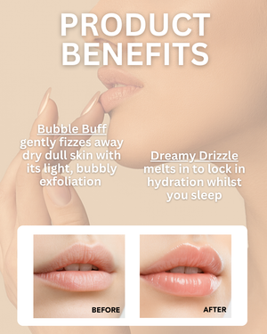 Meet the duo your lips dream about. Bubble Buff gently fizzes away dry, dull skin with its light, bubbly exfoliation - smoothing and priming your lips for the ultimate overnight treat. Follow with Dreamy Drizzle, a silky, nourishing lip oil that melts in to lock in deep hydration while you sleep.